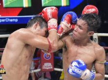 Yodthongthai Kiatcharoenchai (126lbs, RED) vs Saen Pranchai (127bs, BLUE). Yodthongthai as well as Saen defend 2 Mio. Baht on the “Kiatpetch” promotion at the New Lumpini Stadium, Bangkok.
