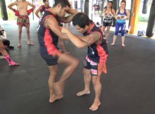 Kru Boo as well as Kru M educate a fundamental rearrange of a challenger in the clinch to establish a knee strike, in the newbies Muay Thai course
