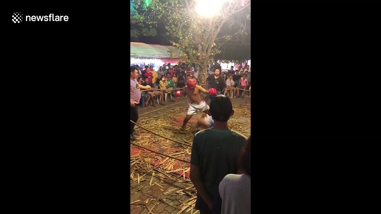 Footage from last Friday (January 18) shows how the fighter in blue shorts took two right hooks to the head – knocking him down onto the hay-covered ground.